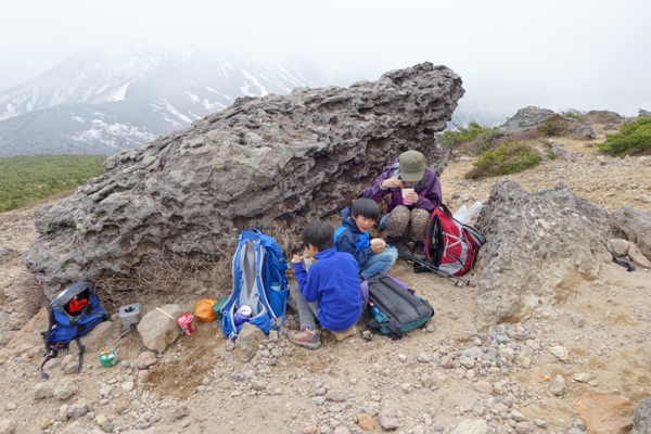 風が強いので岩陰に身を寄せて昼食。 去年は雨の中おにぎりほお張るだけで退散したので、これくらいの風くらいね。 |