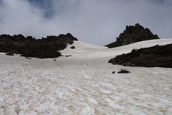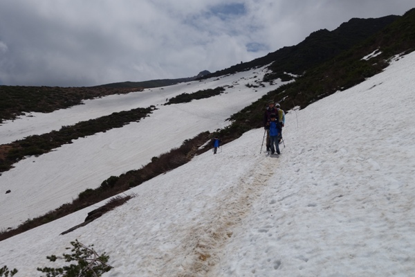 牛の背から峰の辻の間の雪渓。 子供達にストックをもたせるが、楽しそうにざくざく降りてた。 |