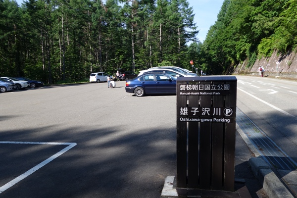 雄子沢登山口の駐車場。登山口の横にも数台止められるスペース有。7時半でほぼ満車でした。 |