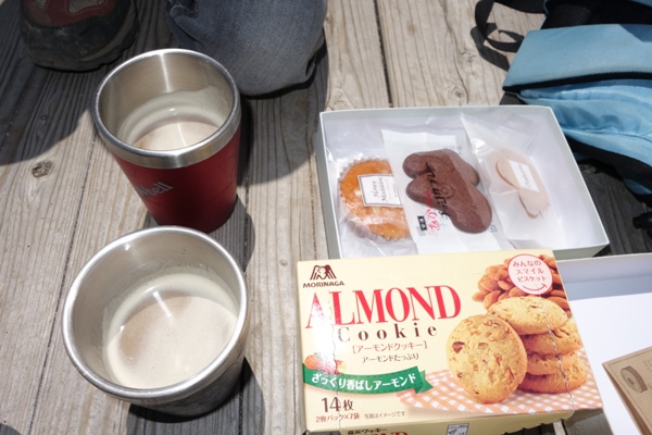 木道横のスペースでティータイム。 10時のおやつのつもりが遅くなっちゃったけどね。。 |