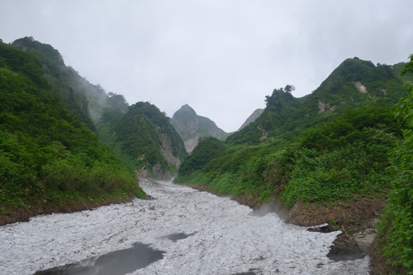 山行記へ 山の写真へ 山ある記Topへ ルート 第1日 雨飾高原キャンプ場登山口〜ブナ平〜荒菅沢〜笹平〜雨飾山〜笹平〜荒菅沢〜ブナ平〜 雨飾高原キャンプ場登山口 備考 累積標高差:約800m コースタイム:6時間半 “立山の帰りに別の山に寄ってから帰ろうよ。”“どこ行くの?”“雨飾山。”“ふーん、どこ?” “どこといってもねえ。とりあえず麓にキャンプ場あるから。”“バーベキュー?”雰囲気のいい名前の山だけど 100名山リスト眺めるまで知らなかった雨飾山へ。 第1日 登山口のキャンプ場で前泊し、6:20に出発。 広河原までは平坦な道で、2/11の標識から登山開始。山頂まで400mおきに標識があるのでどれだけ歩いたかが 分かりやすい山です。子供達も看板が出てくると山頂に近づいているのが実感できて良かったみたい。 2/11から3/11の標識の間で森の中からガサゴソ物音がし、家族全員一瞬フリーズ。顔を見合わせた後静かにその場を 立ち去ったのですが、何の動物だったんだろう・・・。まだクマには出会ったことないけど、びっくり。 登山道自体はよく整備されていて歩きやすく、ブナ平まではそこそこ急な登りで、ブナ平から荒菅沢までは なだらかな道が多く快調。 荒菅沢は雪渓が残っていたものの融雪が進み真中に大穴があいていて、踏み抜いて落ちたら危険な状態でした。 どこを渡ったら安全なのかと思うとこでしたが、ちょうど前を歩く方がスタスタと穴の少し下を迂回しながら 渡って行かれたのでこれ幸いと便乗して同じところを歩き、無事に対岸へ。助かりました。荒菅沢から見上げる 雨飾山、尖った山頂がなかなかかっこよく、雪渓とあいまってなかなかいい感じでした。設計を吹きおろしてくる 風も涼しく絶好の休憩スポットですね。ちなみにヤマレコ見ると3日後には雪渓が崩れて川を渡っているよう だったので、雪渓を渡るのはこの日くらいまでだったんですね。そういえば雪渓で休憩している間もドーン、 ドーンと崩れる音がしてました。渡ってる間に崩れなくて良かった。。 さて、荒菅沢から笹平まで標高差450mの登り開始。結構急でしんどい登り。荒菅沢からしばらく登ると 視界が開け高山植物も出てくるのが救いです。ガスで遠望が利かなかったのだが、目の前に立派な山があった。 地図見ると金山、天狗原山っぽい・・・って雨飾山より標高高く2200m超えてる。まだまだ知らない山がいっぱい ありますねえ。森林限界を超えると岩場も出てきてロープやハシゴがあるところも。休み休み歩いて笹平に 到着すると山頂までなだらかな笹原が広がり、右奥に雲海の上に浮かぶ白馬連峰もこんにちわ。とてもいい雰囲気。 花もよく咲いている笹原を気分良く歩き、山頂直下の登りをひと頑張りすると山頂到着。手前の北峰に石祠、 奥側の南峰に山頂標識や三角点があり、どちらも広くないけど少し開けた感じになってました。朝食が 少なかったせいか、最後の登りで空腹感がはんぱなかったので手前の北峰で何はともあれ昼ごはん(笑)。 雲海に浮かぶ後立山連峰を見ながらの昼ごはん、夏休み3回目のパン食でも幸せ感。快晴だと槍の穂先や妙高方面、 日本海等々も見えるらしいですが、今回は残念ながら雲の中。 昼ご飯を食べて落ち着いた後、南峰で記念撮影して下山開始。上から見る荒菅沢、お花畑の下に雪渓、渡った ところは結構下の方に見え、登ってきたなと実感出来るところ。笹平から荒菅沢の間の下りでも足に来て、 男三人、荒菅沢で嫁さんを待ちつつ大休憩。その後も休み休み歩いて13時半頃キャンプ場に到着。 登山口にある自動販売機で炭酸飲料買って4人でお疲れさんの乾杯。持って行った4Lのお茶とスポーツドリンクも ちょうど空、曇ってて直射日光にやられなかった割に消費しました。晴れてたらもっと消耗したんでしょうね。 立山を歩いた疲れも抜けてなかったのか、思ったより疲れた感じでした。キャンプ場の売店で山バッチを買い、 一路郡山へ。郡山に戻って夕食を食べに餃子の王将へ行ったものの、寒気がして食欲が出ない、、、 家に戻ると38℃弱でダウン。翌日の仕事は午前半休でふらふらしながら午後やっつけ仕事。。。ユンとリョンも 続けて体調不良になり発熱と下痢などを発症。3人ともお腹をやられたのだが、これといって思い当たる食事は なく、嫁さんのみ元気だったので立山の快晴で日差しにやられて体力を消耗したせいだということに。 テト泊装備で何日も縦走してアルプスを歩く方たちの体力、すごいもんですねえ。そのうちテン泊装備かついで 歩きたいけれど、今年はまだ無理かな。。。雨飾山、晴れていれば眺望も良く、森林限界超えると花もたくさん 咲いていて有名な紅葉時期でなくても楽しめる山でした。近くにある北アルプスと比べると地味ですが、東北に あったらもっと人気出たろうな。 2015.9.6記 山歩き前のキャンプ 2015年8月10,11日 雨飾高原キャンプ場 |