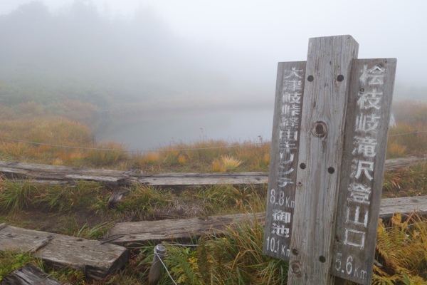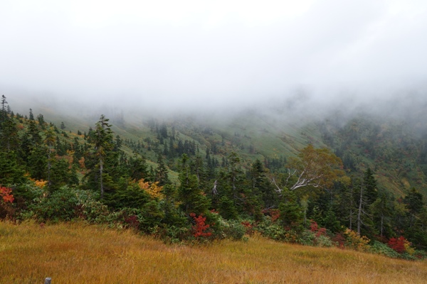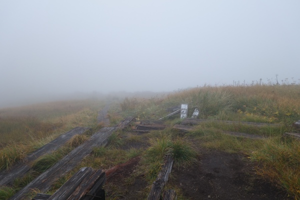 この先が中門岳ですが、視界も時間もないのでパスします。 今度は晴れている時に来て歩きたい。 |