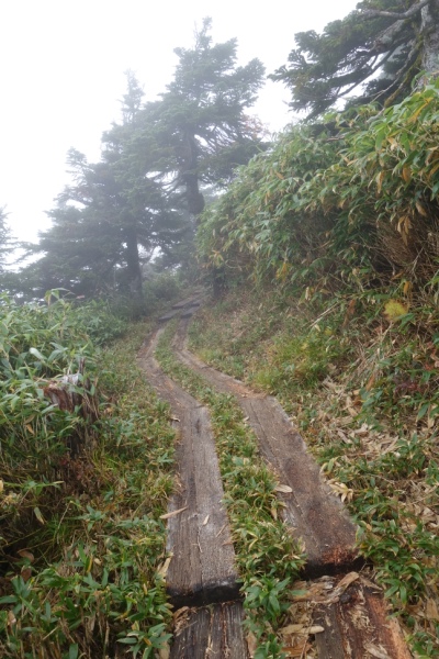滑りやすい木道を歩いて山頂を目指します。 |