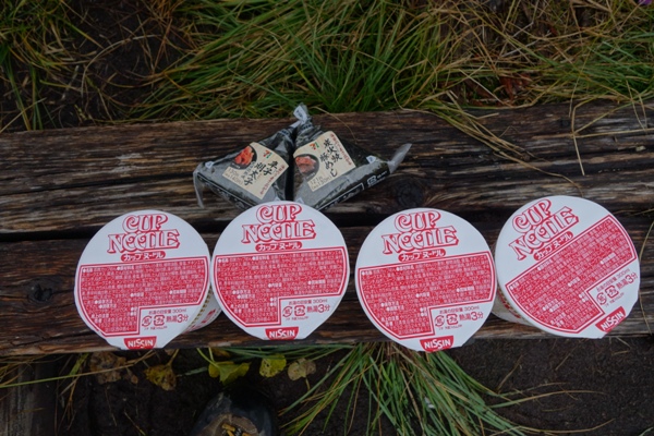 中門岳との分岐でベンチが有ったのでお昼休憩。 カープラーメン、子供達が少ししか食べず親がほぼ2個ずつ食べる羽目に。。 2個目の延びたカップラーメンはちょっと、、、 |
