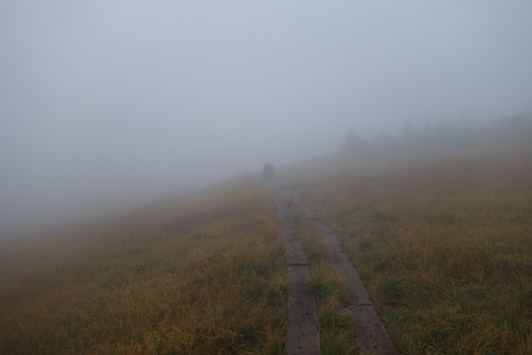 休憩を終えて歩き始めるとガスの中、、、 |