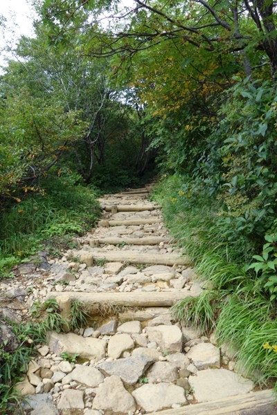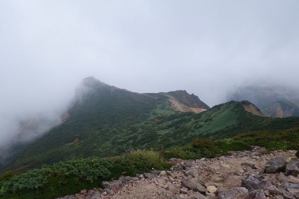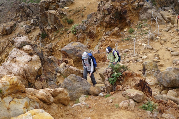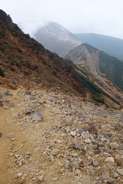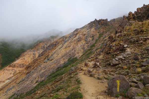 朝日岳への道は荒涼とした岩場の道が続きます。 |