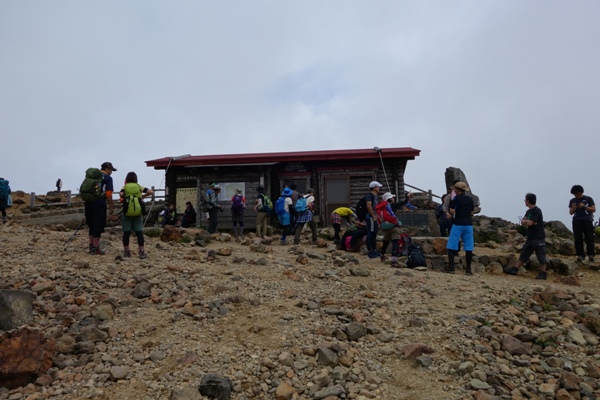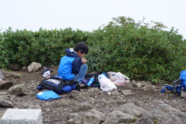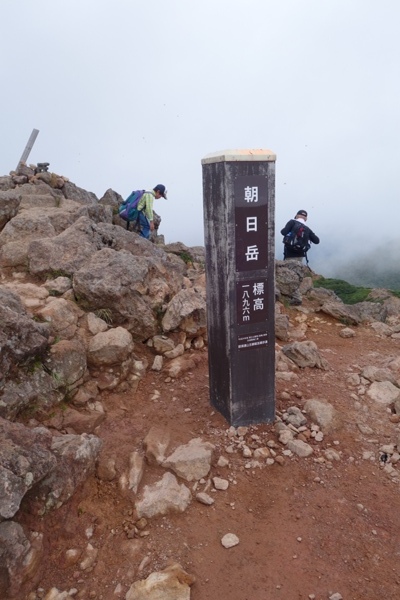 朝日岳到着。 羽虫がいっぱいで早々に退散。 |