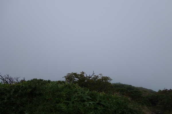 茶臼岳山頂は雲の中。 雲が取れてくれないかなと期待しつつ・・・ |