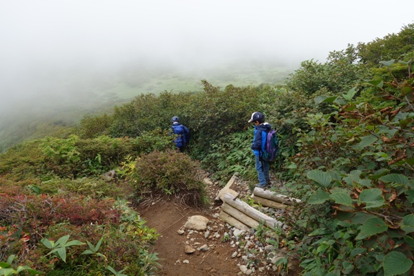 朝日岳の肩まで戻ってきました。 下りは慎重に。 |