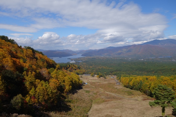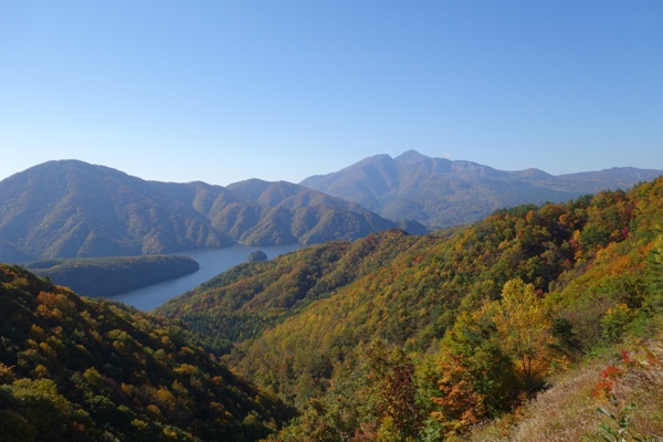 レークラインから秋元湖と磐梯山を望む。秋晴れのいい天気。 |