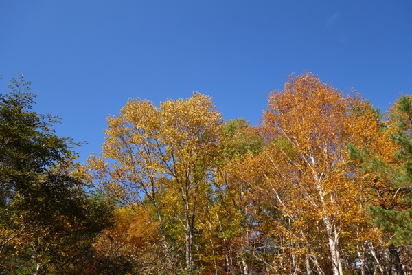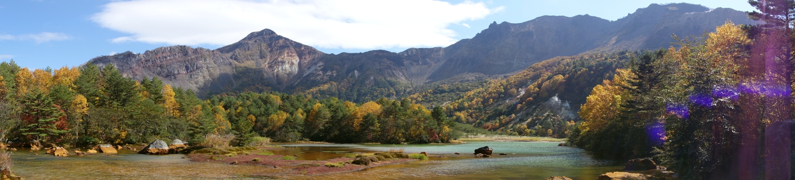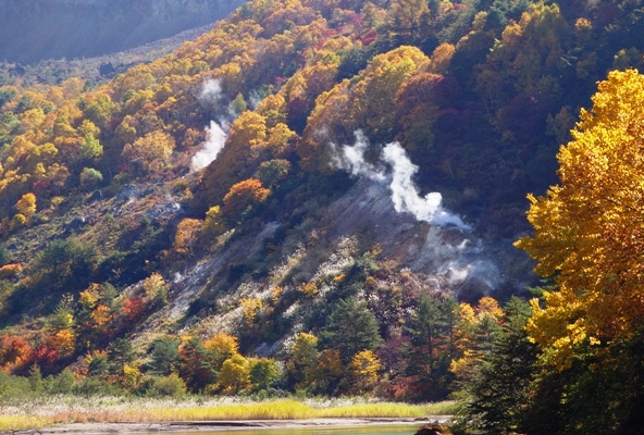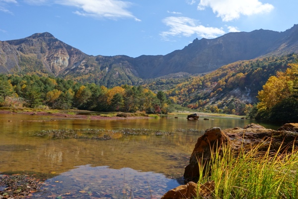 荒々しい山肌が銅沼に映り、青空の下に沼や紅葉の色があいまって素晴らしい景観になってました。 |