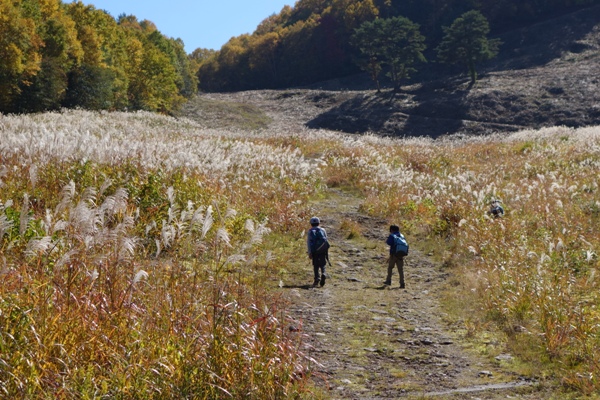 ススキの中を歩く子供たち。 |