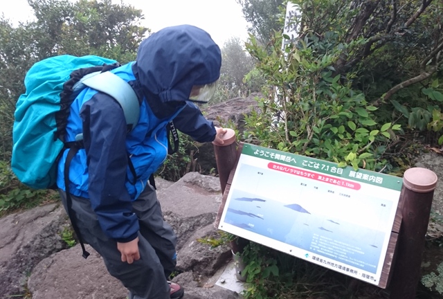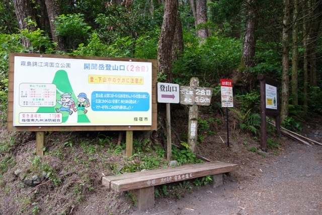 2合目の登山口に到着です。 看板の案内では子供のコースタイムは6時間〜午後から荒れ模様の天気予報なので頑張りましょう(笑)。 |