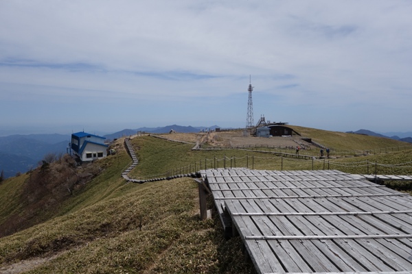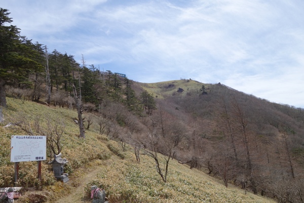 右側のご立派な建物がトイレのよう。 頂上ヒュッテは裏側で山頂からは見えず。 |