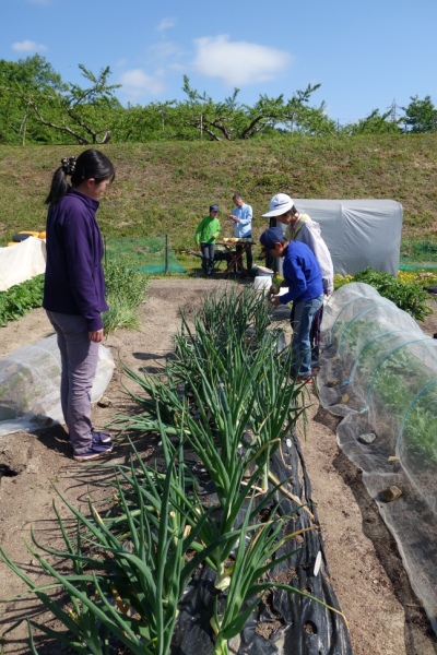 翌日、両親がやっている畑で玉ねぎの収穫体験を楽しむ子供たち。 |