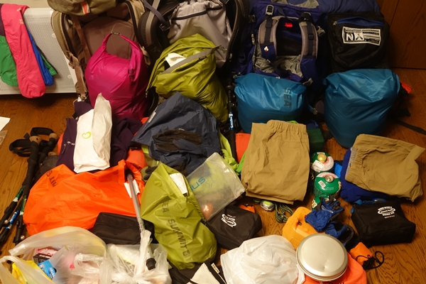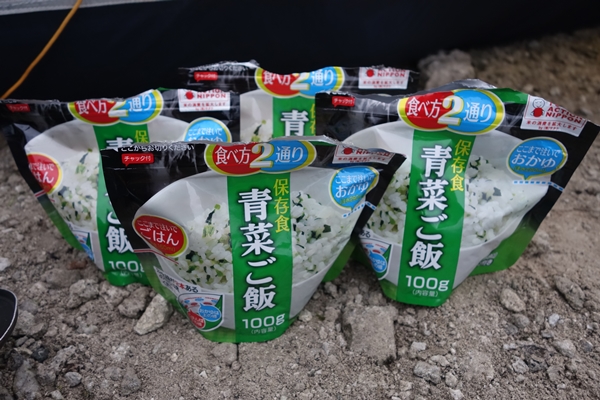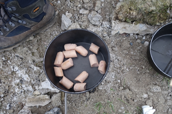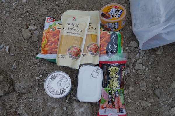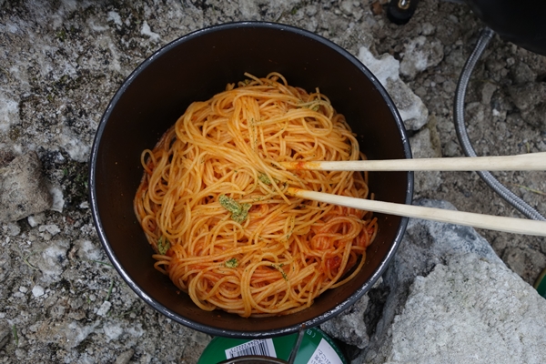 夕食はパスタと缶詰など。 昼が行動食だけだったので早めに準備開始。 |