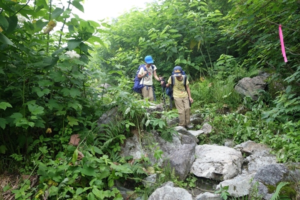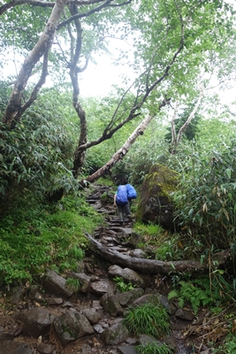 白馬尻小屋へ向かう道との合流点まで到着。 初日の雨の後、レインコートをなくしていた長男。 それに気付かず、雨に打たれながら下山することになってしまいました。 |