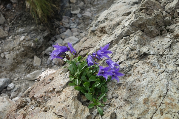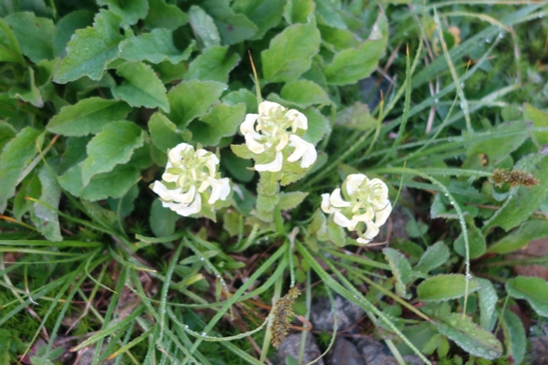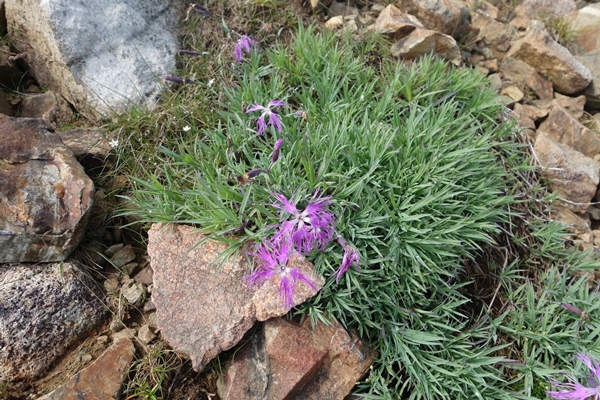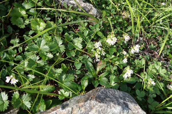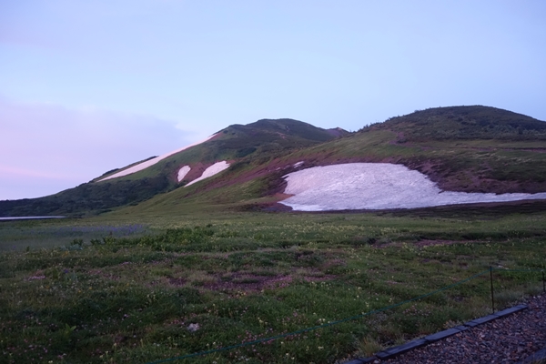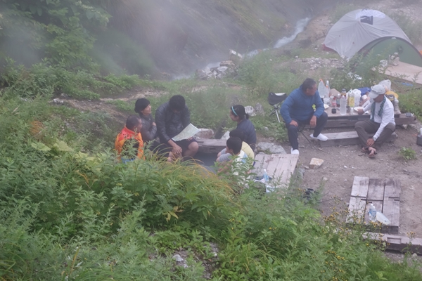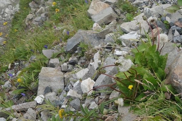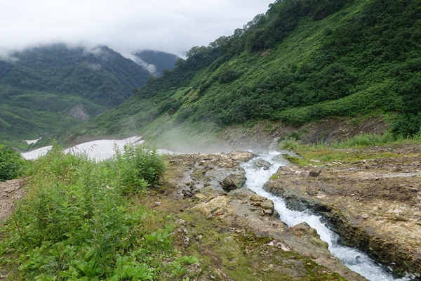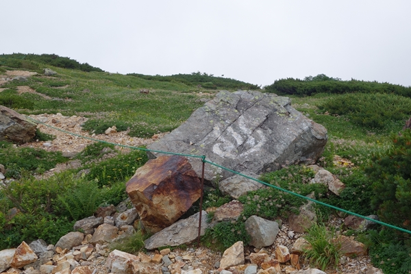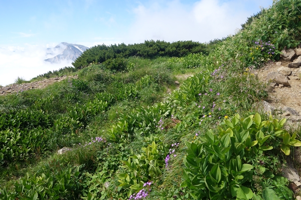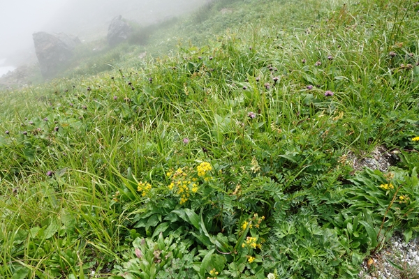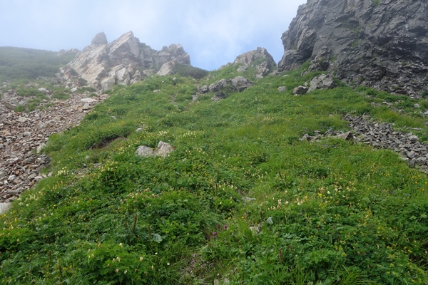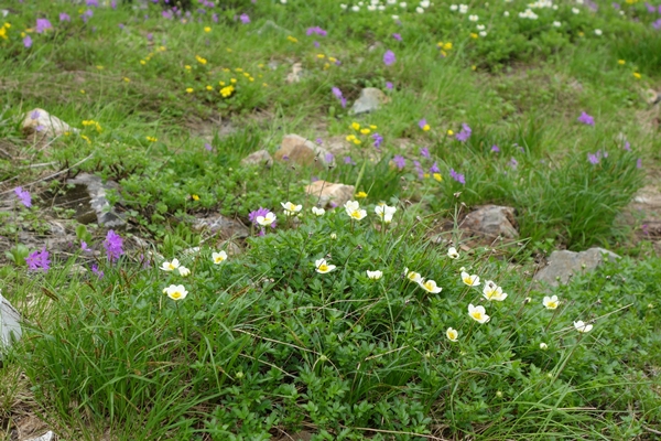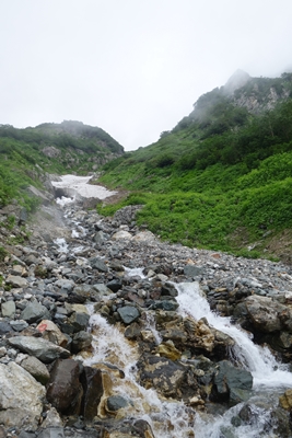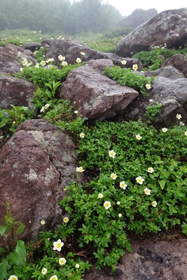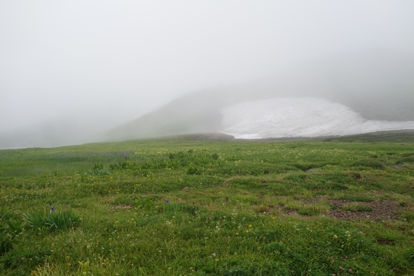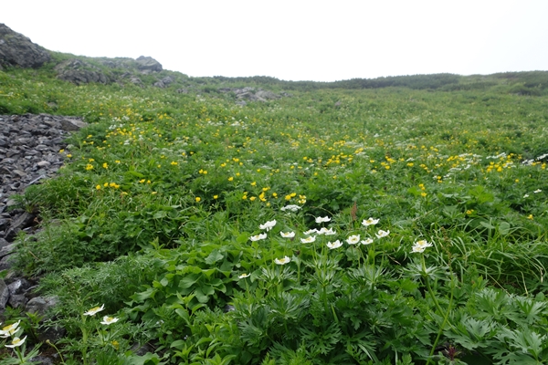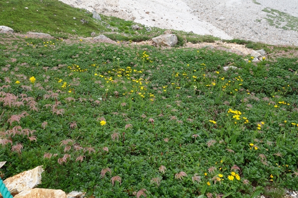 大出原だったでしょうか。 お花畑で休憩。チングルマやハクサンコザクラほか、きっといろいろ咲いていたものと思われます。 |