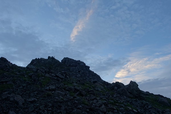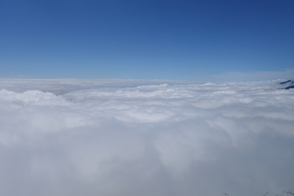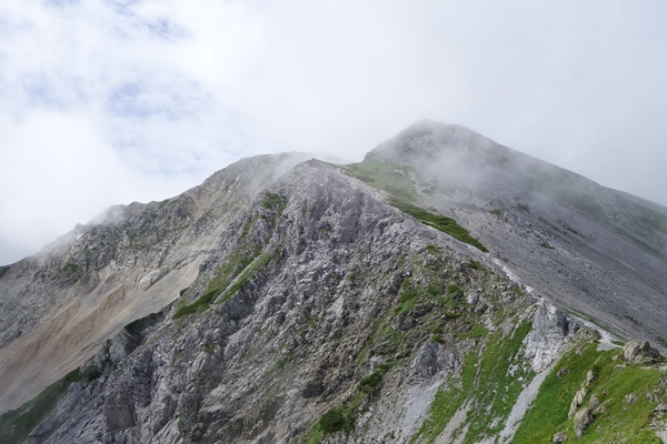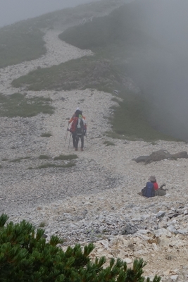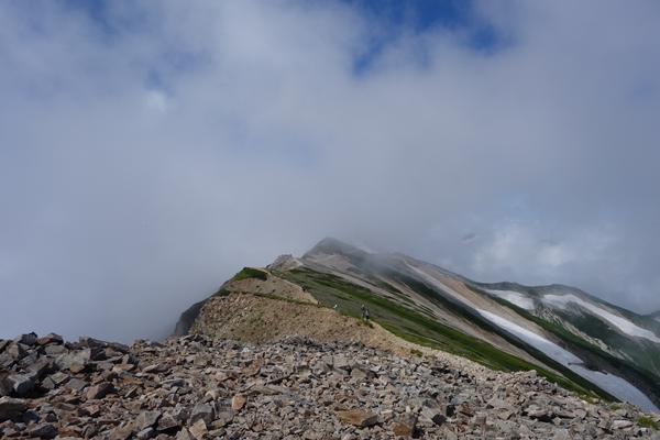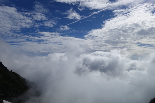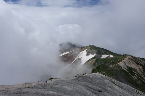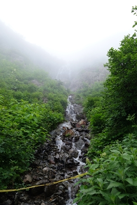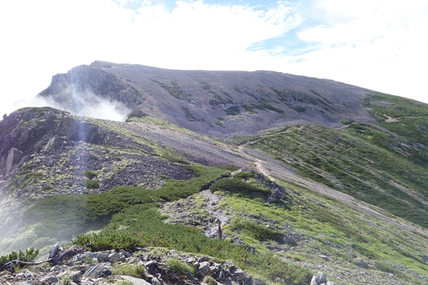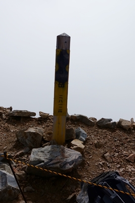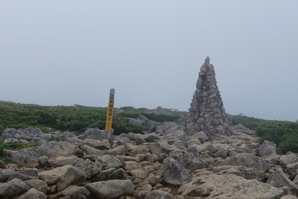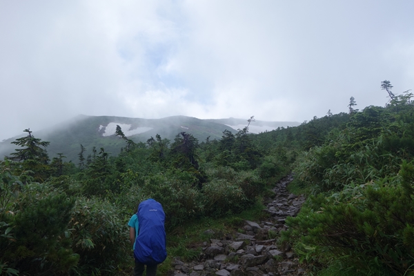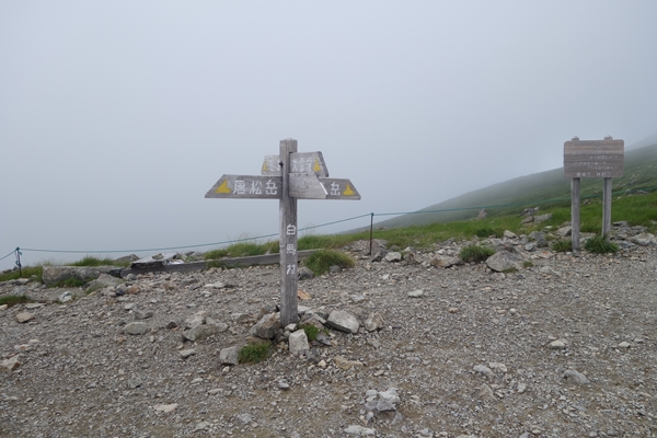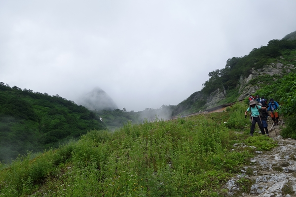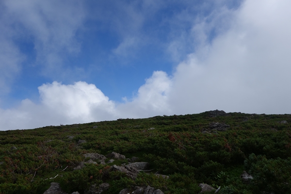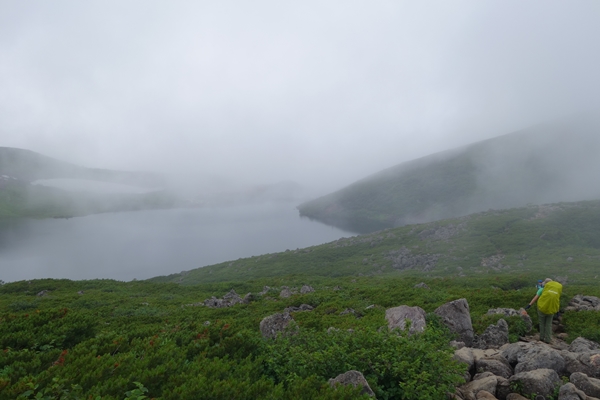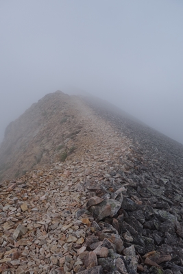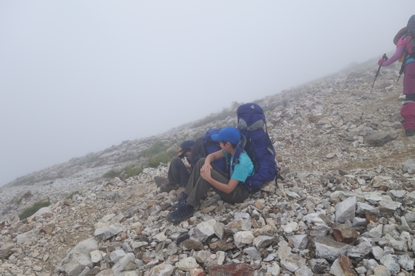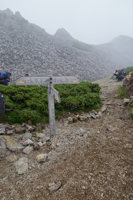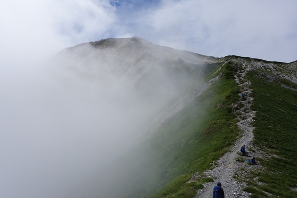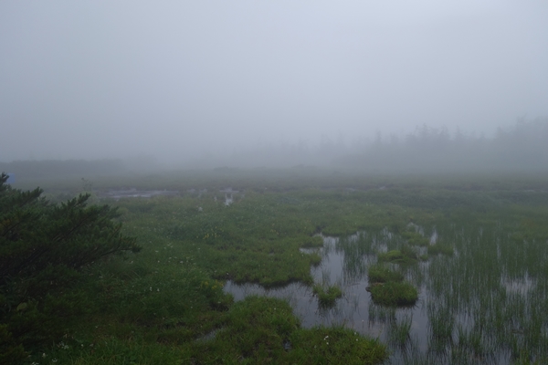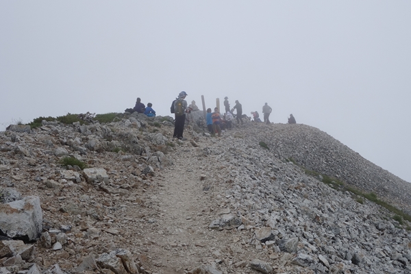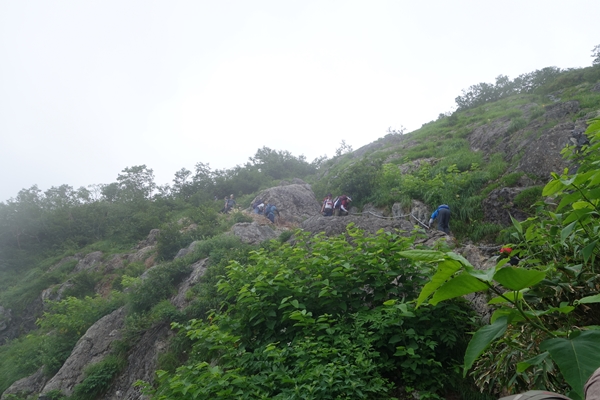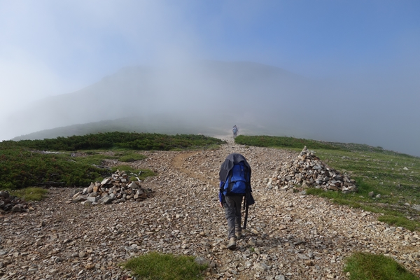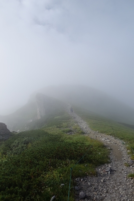 すぐにガスが上がってきて視界不良に。。 出発がもう少し早ければと若干の後悔の念が。 |