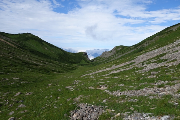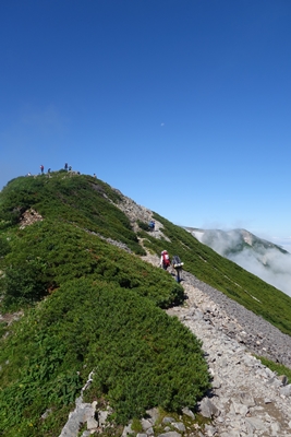 気を取り直して下山します。 どこまでも続く稜線、すごいですねえ。 |