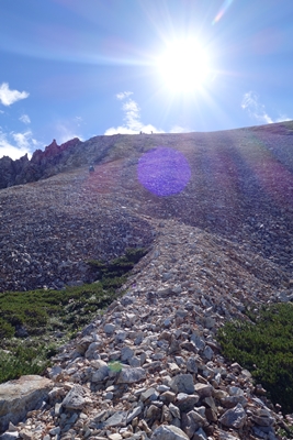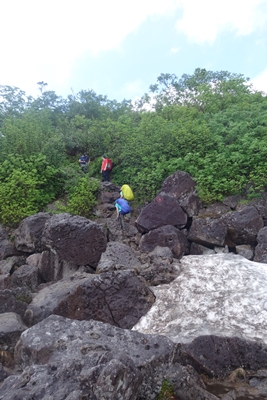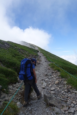 もうあと一息だよ。何だかんだで白馬岳到着のトップはリョン。やる気さえあれば一番早いのにねえ。 |