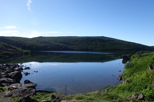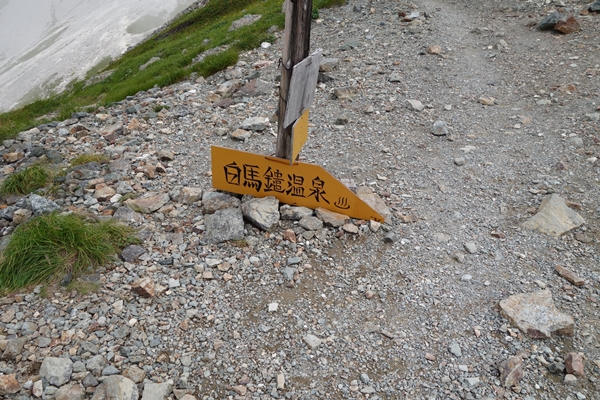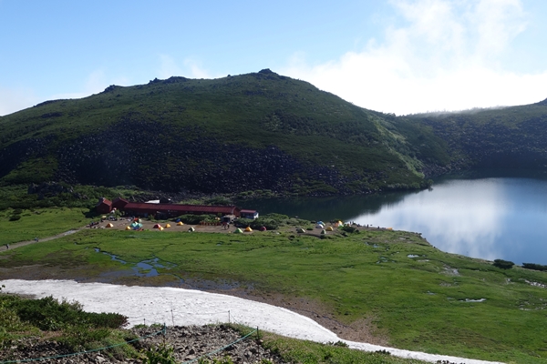 白馬大池が見えました。 対岸に見えるキャンプ場を目指してもうひと歩き。 |