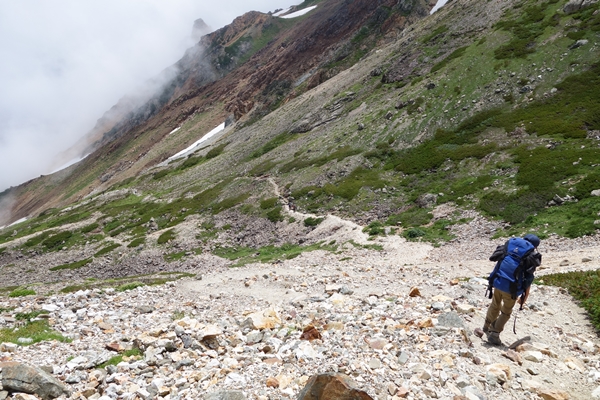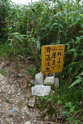 小日向のコルまでは山肌を下ったり登ったり。 悪路と言われるだけあって、崖で道幅が狭いところが多いですね。 |