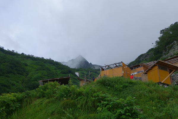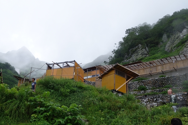 毎年立て直しているという鑓温泉小屋。 すごい所に建ってますね〜。 |