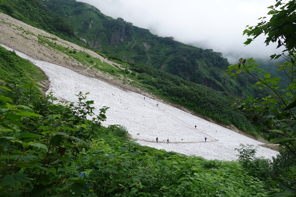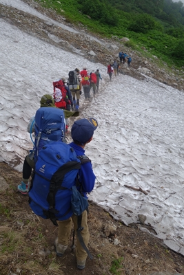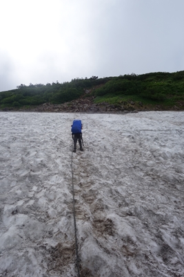 雪渓を渡ります。 凍っているので慎重に進みました。 |