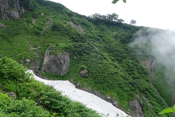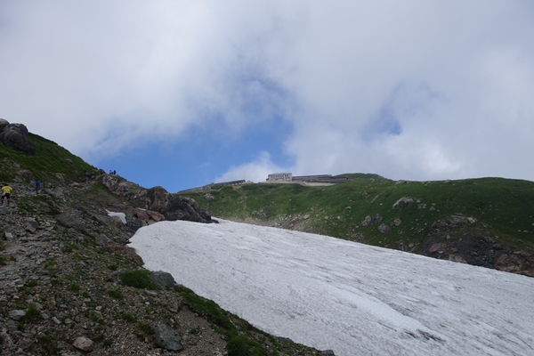雪渓が出てきて、ほどなく鑓温泉小屋に到着。 |