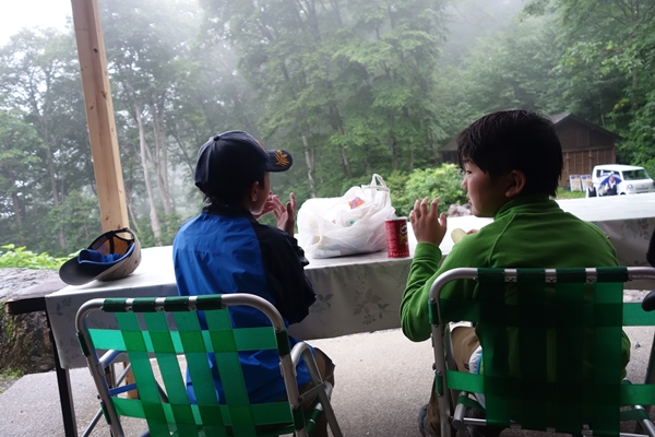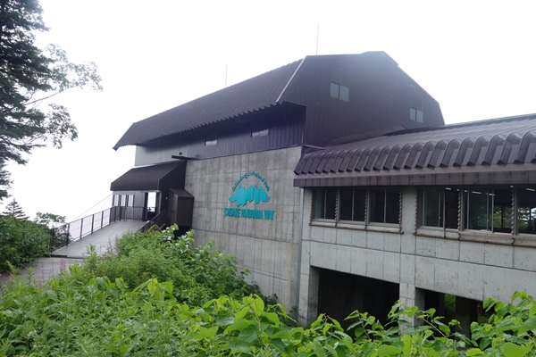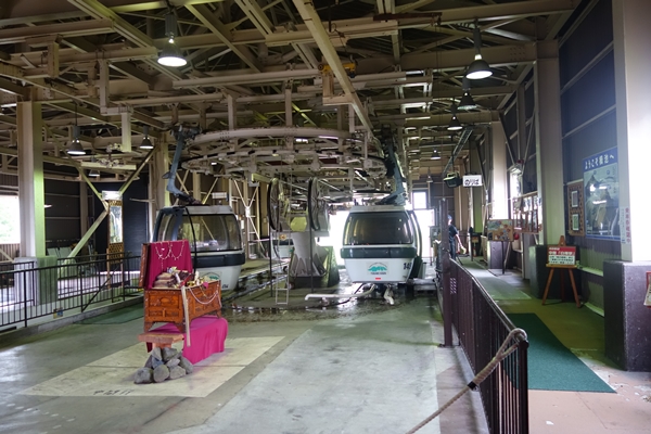 ロープウェイ乗り場まで歩きます。 切符売り場でザックの重さを量ったら長男11s、次男9sでした。ちなみに嫁さん15s強で追加料金とられました。家で測定した時よりどれも2sくらい重く、早くは借りを返すよう言われて測定できなかった自分のザックは20s弱だっと思われます。 軟弱一家はこの時点でザックの重さにテンションダウン(苦笑)。 |