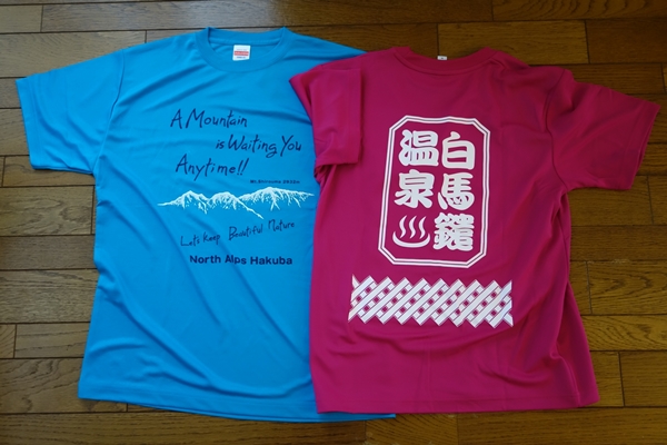 お土産1〜頂上宿舎と鑓温泉のTシャツ。頂上山荘のTシャツは嫁さん用の色違いがもう一つ。 |