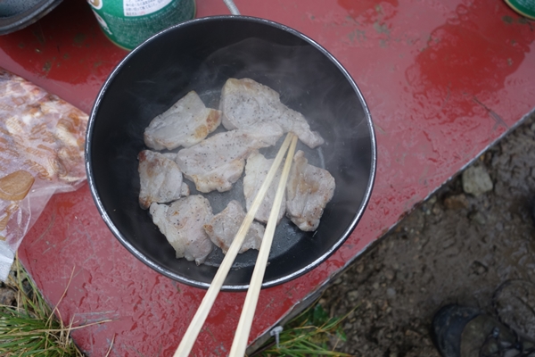 雨が少し強くなる中、夕食タイム。 まずは焼肉。 |