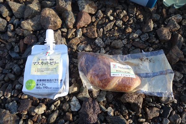 朝ご飯はパンと保冷剤替わりだったゼリー。 お腹に入れて荷物の軽量化。 |