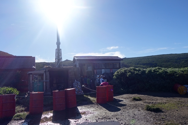 受付とテント泊者用のトイレ。 左の黄色いタンクが飲料水タンクで、よく給水待ちの行列ができていました。 |
