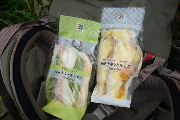 少し歩いたところで昼食タイム。 サンドイッチが潰れたと嘆く嫁さんと長男。 そりゃそうでしょ(笑)。 |