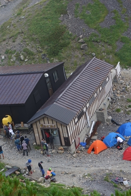白馬大池山荘で受付。 山荘は2畳で3人の混雑が予想されますとの看板がありました。 |