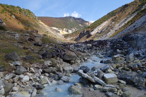 山行記へ 山の写真へ 山ある記Topへ ルート 第1日 沼尻登山口〜白糸の滝展望台〜胎内コース分岐〜沼尻鉱山跡〜胎内岩〜鉄山避難小屋〜鉄山〜矢筈森〜沼尻分岐 〜船明神山〜胎内コース分岐〜白糸の滝展望台〜沼尻登山口 備考 累積標高差:約800m コースタイム:5時間 “明日の仕事キャンセルになった。”“明日天気いいみたいだよ。山行く?”“いい時期だもんね〜。” “ユンは?”“行こうかな。”“リョンは?”?なんかやだな〜。”やはりノリの悪かった一名。。 第1日 天気の良さそうな週末。さわやかな季節、せっかくなので山に行くかと家族に声をかけるが次男坊はやる気なし。 仕方がないので3人で安達太良山へ。今回はいつもの奥岳登山口ではなく、反対側の沼尻登山口から歩くことにして 出発。スキー場の奥にある50台ほどとめられそうな駐車場はほぼ満車で、沼尻登山口もなかなかの人気のようでした。 歩き始めたのは10時半前、のんびり家を出てきたので遅い出発でした。立派な案内板のある登山口を少し歩くと すぐに白糸の滝展望台に到着。展望台は2つあり、滝や吾妻連峰が見え、すでに良い景色。目指す鉄山が遠くに見え、 嫁さんとユンは?ここで帰ってもいいんじゃない”とゴニョゴニョ。まだ10分も歩いていませんよ〜。。。 というわけで先に進みます(笑)。 色づいてきている林の道を登り、木のトンネルをくぐり尾根道から沼尻鉱山跡が見える分岐へ到着。 沼ノ平から流れてくる川に沿って登山道が見え、数人の方が歩いているのも見えました。一旦下らないと いけないですが、爆裂火口を周回したいので我々も川に向かって下ります。川に降りてくるとなかなかの硫化水素臭、 温泉が流れているような感じの川の色でした。廃墟の横を通り、秋らしいススキが揺れる川沿いの斜面を進みます。 しばらくしてこの日一番の登りになり、標高を上げると裏磐梯方面の視界が開け、磐梯山もきれいに見えました。 久し振りの山歩きで息切れ気味の嫁さんを待ちつつ、色づき始めた紅葉や景色を楽しみながら歩けるルートで ございます。胎内岩は狭くてザックが引っ掛かりそうなのでくぐらずに岩の上を乗り越えましたが、嫁さんは ザックを岩の上においてくぐってました。胎内岩からはなだらかな尾根道で、吾妻連峰から磐梯山まで一望、 鉄山や沼ノ平の火口も目の前に広がり気持ちの良い道でした。出発が遅かったので既に12時40分頃、嫁さんやユンが お腹が空いたということで、石楠花の塔の手前でお昼ご飯。景色がいいので何食べても美味しい感じでしたが、 登山口へ向かう途中で買ってきたパン、なかなか美味しかったです。 エネルギー補給して鉄山へ。こじんまりした避難小屋を通り過ぎ、火山の監視カメラのある鉄山山頂に到着。 荒々しい沼ノ平と紅葉広がる穏やかなくろがね小屋方面の山肌が対照的でした。360°の大展望を満喫して 先に進もうと思ったら道がない・・・少し手前に戻らないといけなかったのですが、鉄山山頂からそのまま 先に進もうとして危うく登山道でない崖を歩くところでした。。。ちゃんと確認しないといけないですね。 登山道に戻り、馬の背から船明神山に向けて分岐を右へ。安達太良山の山頂が目の前ですが、時間も遅いので 今回は(?)パスしました。これで三回連続で山頂踏んでませんねえ。初めてのお山でないと山頂に着かなくても いいや感が大ですね(笑)。その後、火口ををぐるっと回って下山。16時頃に沼尻登山口に到着でした。 朝はほぼ満車だった駐車場、ほとんどの車がいなくなり、数台残っているだけでした。 いい天気でいつもと違う安達太良山を感じ、満足の1日でした。いろんな表情が楽しめる沼尻コース、いいですね。 帰り道、すき家で夕食を食べて帰宅。留守番のリョンにはテイクアウトでお届けでした。ゲームするだけなら 一緒に歩けばいいのにねえ〜。 2017.10.21記 過去の安達太良山歩き 2017年1月2日 安達太良山(7) 2015年12月30日 安達太良山(6) 2015年5月4日 安達太良山(5) 2014年6月28日 安達太良山(4) 2010年10月24日 安達太良山(3) 1999年 9月19日 安達太良山(2) 1998年10月4,5日 安達太良山 安達太良山関係リンク あだたら高原リゾート ・・・あだたら高原のゴンドラ。ブログでは山の情報も。 くろがね小屋 ・・・通年営業の温泉付き山小屋。コース状況もコメント有り。 |