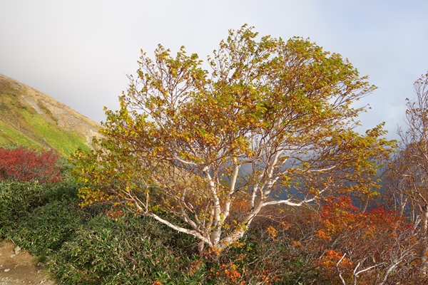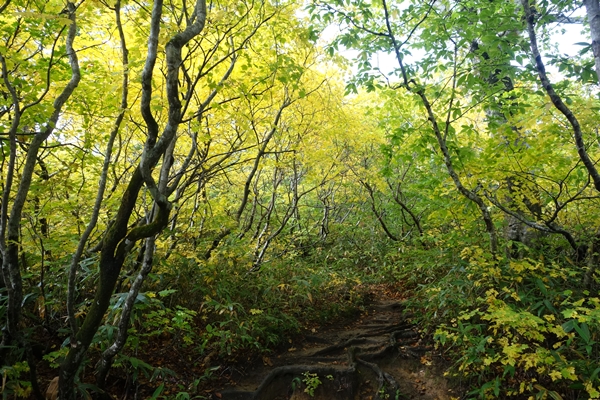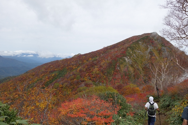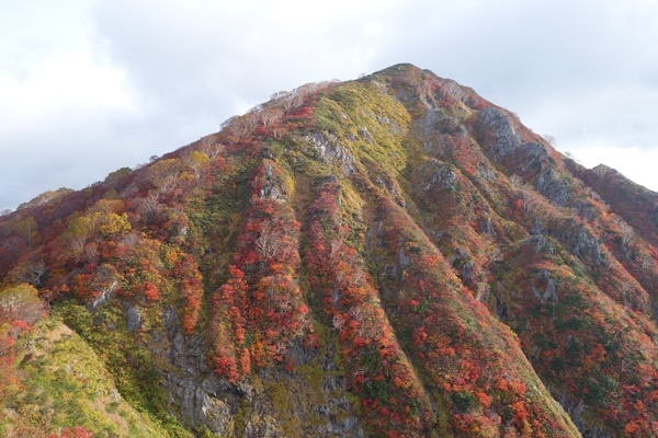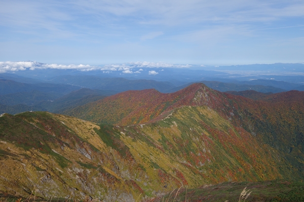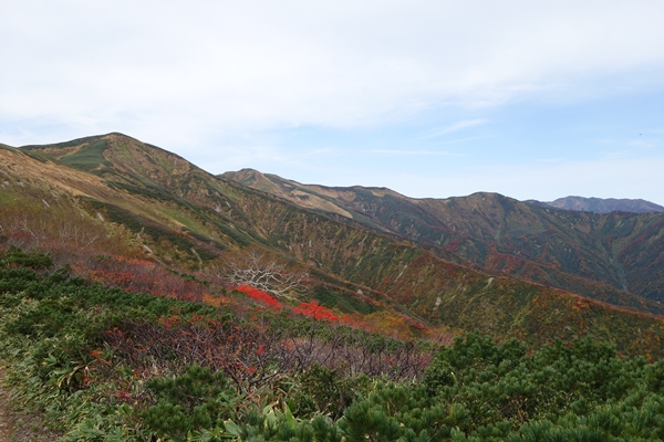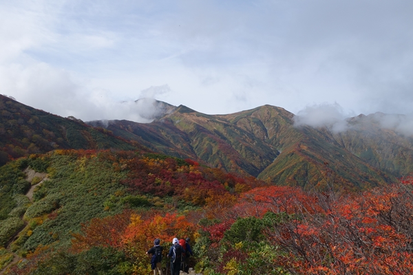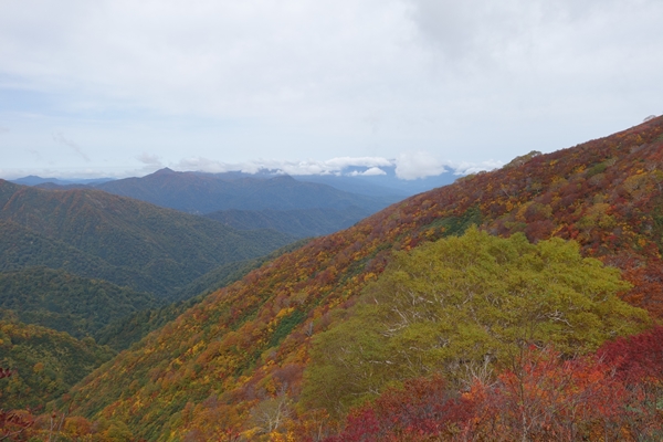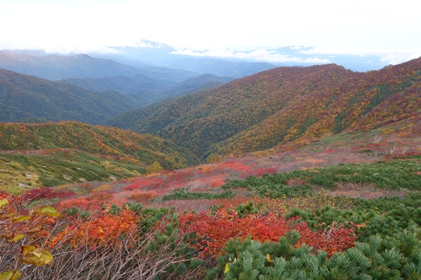 小朝日岳の西斜面に広がるこの辺りの紅葉が一番きれいでした。 |