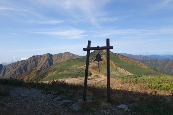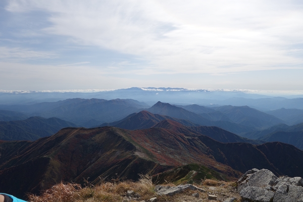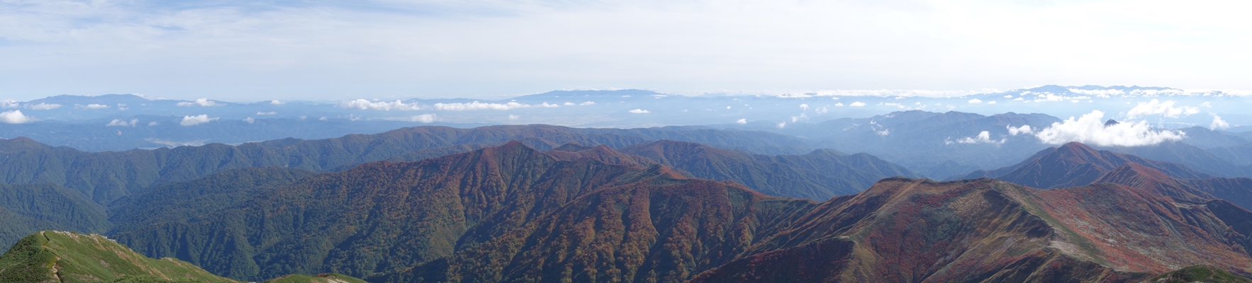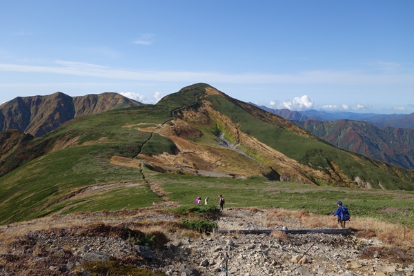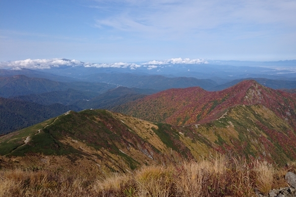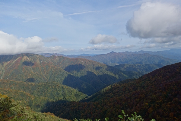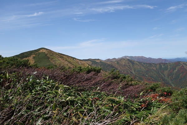 古寺山から縦走路を振り返ります。 朝日連峰、見納めです。 |