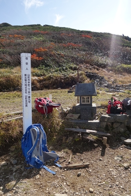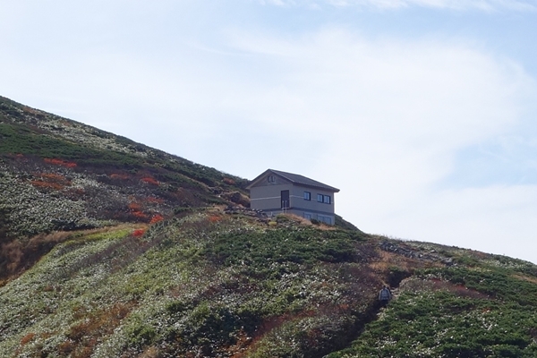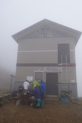避難小屋に荷物を置いて山頂へ向かいます。、 |