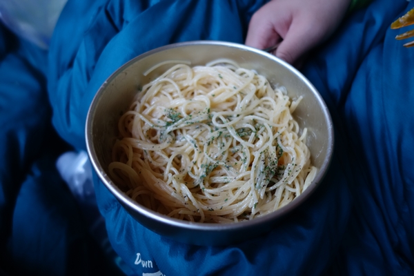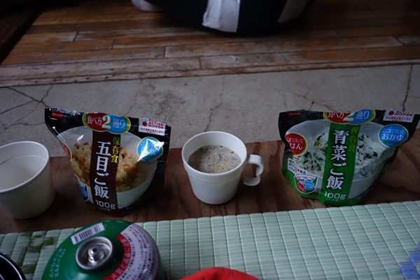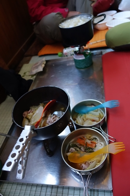 多くの方が出発して空いてきた小屋で朝食。 |