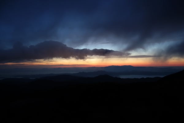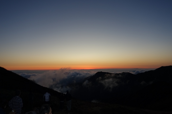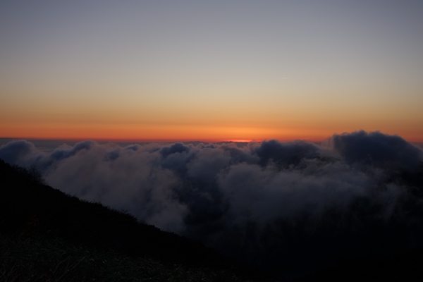 日の出の時間頃には雲が下りてきて、残念ながらご来光は見えませんでした。 |