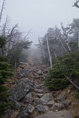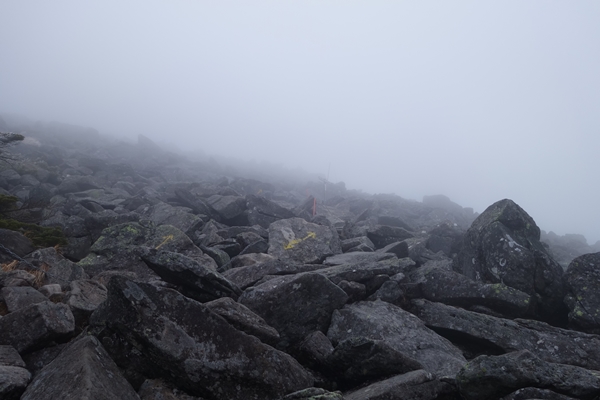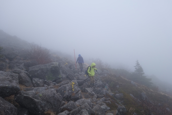 森林限界を越えました。 ガスで山頂がどこかさっぱり分かりません。。 |