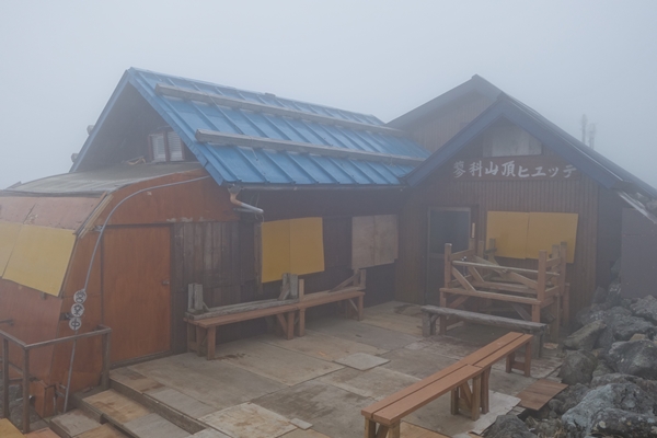 蓼科山頂ヒュッテ、小屋じまいの作業中でした。 開いていたおかげで山バッチが買えて良かったです。 |