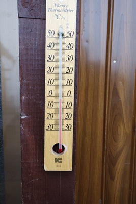 小屋の入り口にあった温度計、-3℃でした。 冬がもうすぐそこといった感じでしょうか。 |