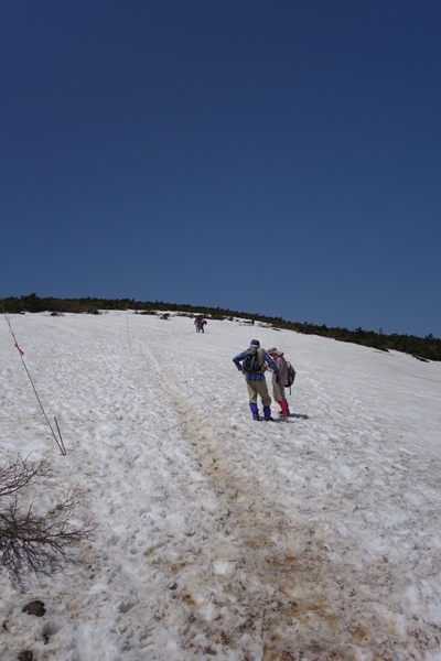 峰の辻到着。 手前の雪渓で子供たちは少しだけヒップそりが出来ました。 |