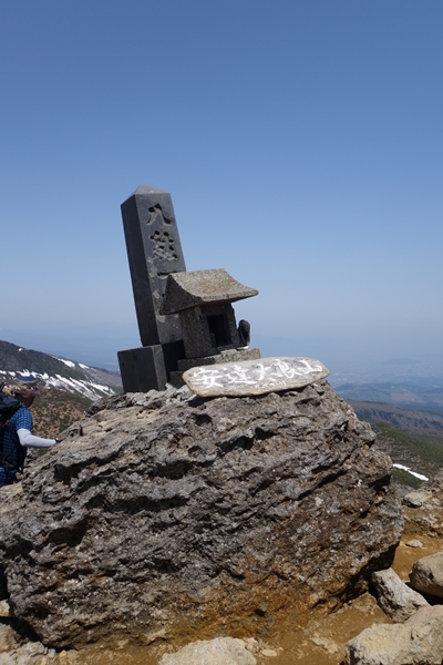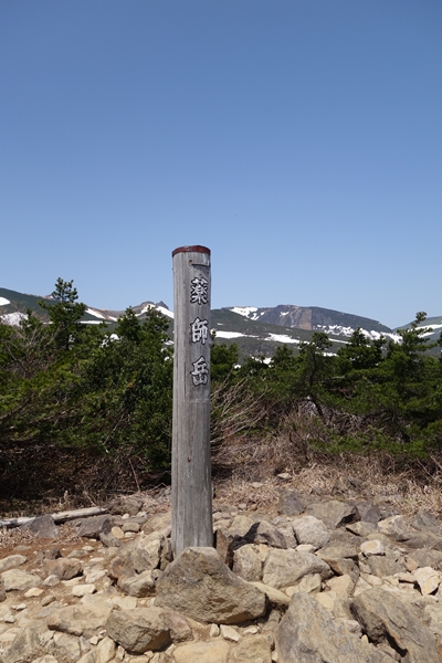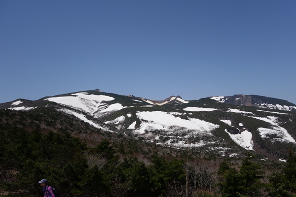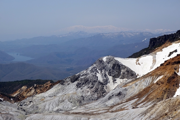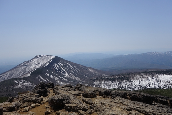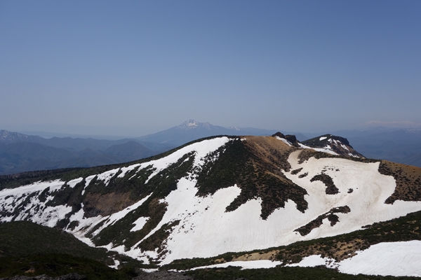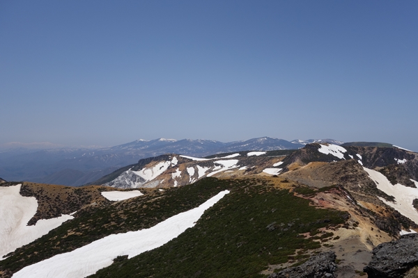 吾妻連峰方面。 左奥に飯豊連峰〜まだ真っ白。 |