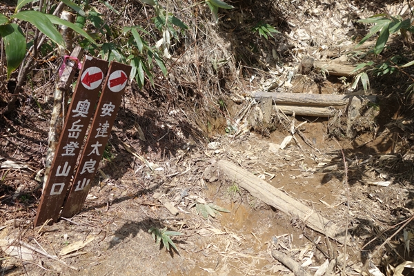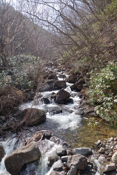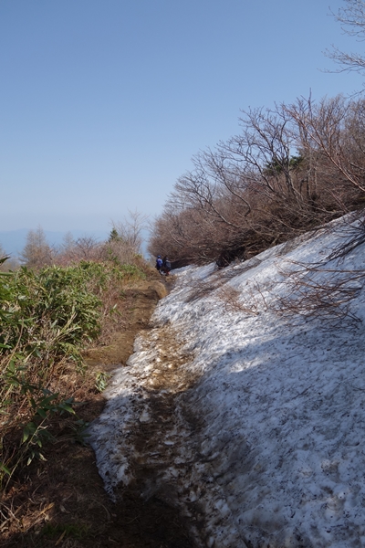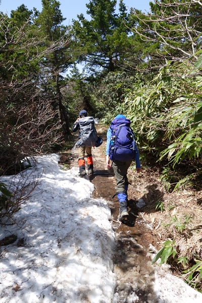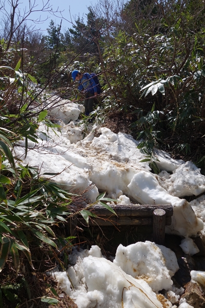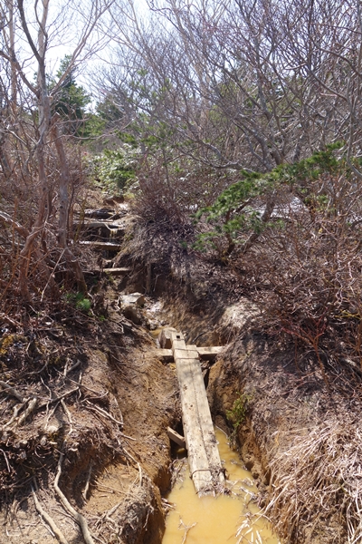 登山道が雪解け水でえらいことに。 |