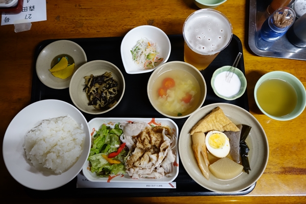 お待ちかねの夕食&この旅初の生ビール。 豚の生姜焼きにおでんとメインが2種! 家族一同、大満足でした。 |